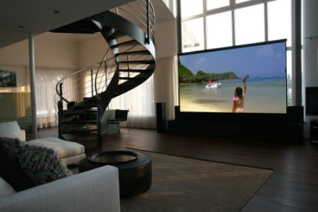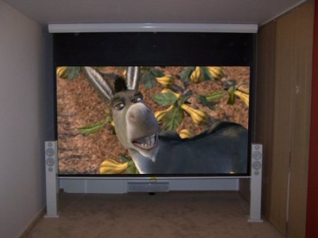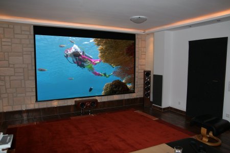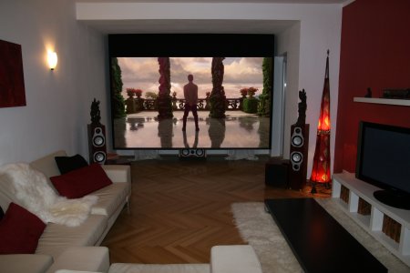 In einer Spezialanfertigung kommt nun eine Leinwand mit Scherensystem aus einem Möbelstück ausgefahren. Und schon kann bei 3 Meter Bildbreite Heimkino pur genossen werden. Neben der Leinwand sind in dieser Wohnung eine Vielzahl von HEIMKINORAUM Verstecken installiert.