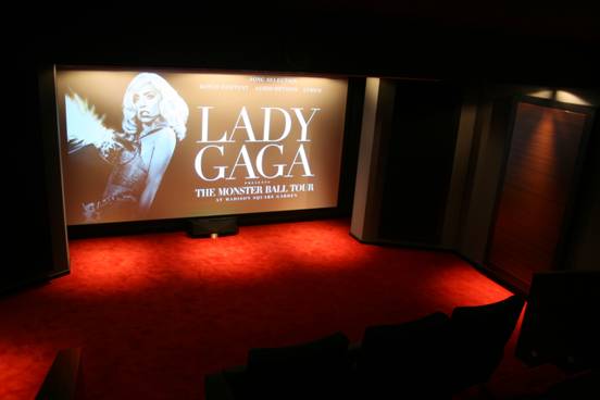 In drei ansteigenden Sitzreihen können Sie nun Platz nehmen und das hochauflösende Bildvergnügen auf der riesigen Leinwand kann beginnen: