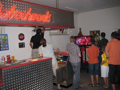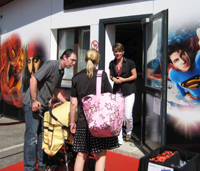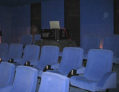 Der Bus fuhr uns in einen weiteren Vorführraum in einem Gebäude, wo es in Deutschland nicht vorstellbar wäre: Tatsächlich hat das örtliche Fernmeldeamt einen Raum in seiner Vermittlungszentrale für einen eigenen Kinoraum vermietet. Nach wenigen Minuten Fahrt dort angekommen, beginnt die Kinoatmosphäre schon im Vorraum, der wie bei einem öffentlichen Kino mit einer Verkaufstheke für Getränke, Snacks und Eis ausgestattet ist.