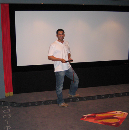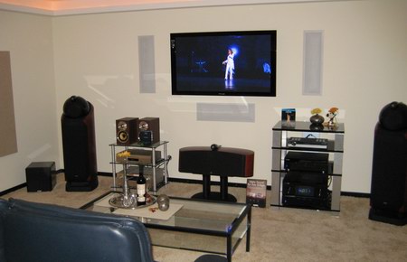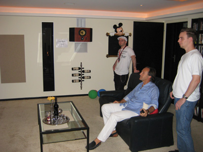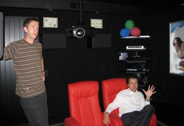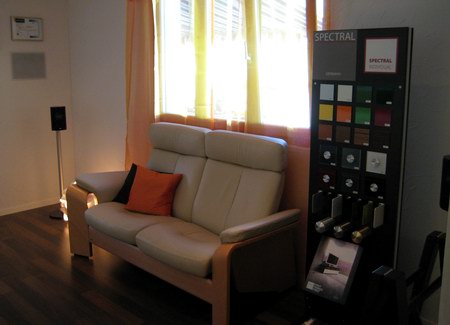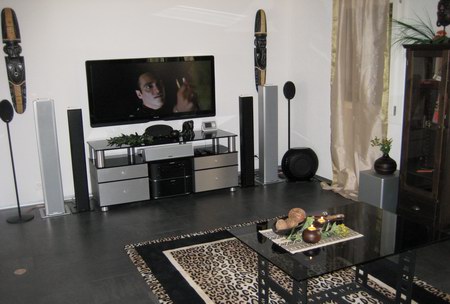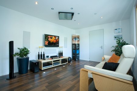 Im ersten Raum geht es noch nicht um das Thema Großbildprojektion an sich, sondern um eine möglichst perfekt ansprechende Symbiose aus Raumgestaltung, Flatscreen und Surroundsound: Alles ist flach, keine Boxen oder überdimensional große Geräte füllen den Raum störend, an keiner Stelle sind Kabel zu sehen. Groß im Kommen sind die flachen Wall-Speaker, die man bei Bedarf auch komplett unsichtbar in der Wand verbauen kann.