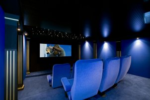 Der Rundgang führt im nächsten Schritt zu einem abrupten Atmosphärenwechsel: Statt eleganter Wohnraumintegration geht es nun um den eigenen, optimierten Heimkinoraum. Dass es sich auch bei wenig Platz nicht um einen „schwarzen Schuhkarton“ handeln muss, beweist der nächste Demoraum: