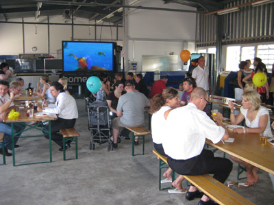 Nach diesen vielen Eindrücken diverser Heimkinoräume nahmen wir uns eine kleine Auszeit auf dem Firmengelände. Bei strahlendem Sonnenschein war im Rahmen der Jubiläumsfeier für das leibliche Wohl gesorgt…