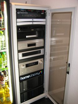 Im zweiten Raum wird alles etwas größer: Hier werden Projektion, Großbild-TV und Kinoton in Referenz-Qualität mit entsprechend hochwertigen Komponenten demonstriert. Der Aufbau ist nicht ganz so dezent, aber dennoch innenarchitektonisch ansprechend.
