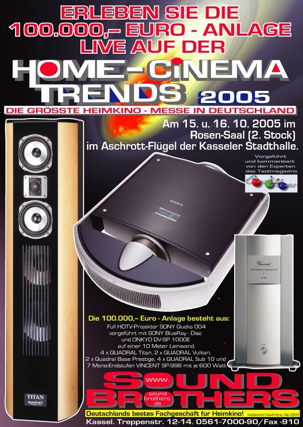 In zwei Tagen ist es soweit! Am 15. und 16. Oktober veranstalten die SOUND BROTHERS mit vielen führenden Herstellern wie in jedem Jahr die Messe "Home Cinema Trends". Ein besonderes Highlight wird eine 100.000 Euro-Anlage, bei der die Besucher auch die Möglichkeit erhalten, einen der derzeit besten Heimkino-Projektoren auf dem Markt zu bewundern.