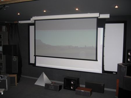 Als erstes demonstrierte uns Jürgen Böttcher eine 3,50 Meter breite Cinemascope Leinwand. Diese 21:9-Format Leinwand passt sich hervorragend an die gesamte Räumlichkeit an. Was mir im Nachhinein aufgefallen ist: Bilder können täuschen. Generell wirken die folgenden Bilder sehr technisch. Was sie leider nicht so gut darstellen, ist der eigentliche Wohlfühl-Charakter dieses Multi-Funktions-Präsentations-Raums. Alles ist mit Teppich ausgelegt. Die Wände sind in Bordeaux-Rot gehalten. In der gesamten Decke sorgen Lichtspots für Behaglichkeit. Zudem ist dieser beeindruckende Heimkino-Showroom riesig. Man fühlt sich nie beengt. Im Folgenden lasse ich mal einige Bilder für sich sprechen.