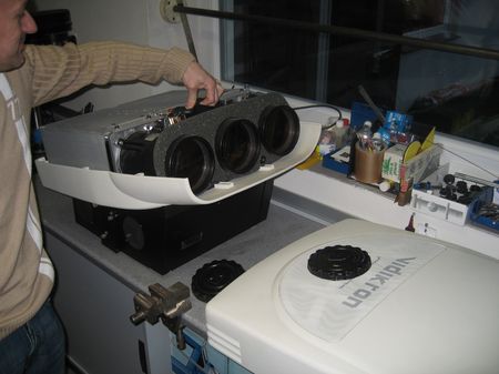 Heimkinomacher bei der Arbeit. Ich war gespannt wie ne Haubesitze auf die neuen Showrooms. Kannte ich ja bisher nur das alte Kellerkino. Jedoch musste vorab noch ein „Good old Vidikron CRT-Projektor in seine kompletten“ Einzelteile zerlegt werden. Mit den Worten „was ihr Cine4home´s in euren Tests könnt, können wir JBS-ler schon allemal“ begann bei uns allen direkt wieder das Heimkino-Herz höher zu schlagen. Das hat übrigens nichts mit Fachidiotie zu tun, sondern mit Leidenschaft zu einem der schönsten Hobbies, die es gibt. Wir Männer sind nun mal technikverliebt. Das liegt in den Genen und deshalb sparen wir auch beim Schuhkauf.