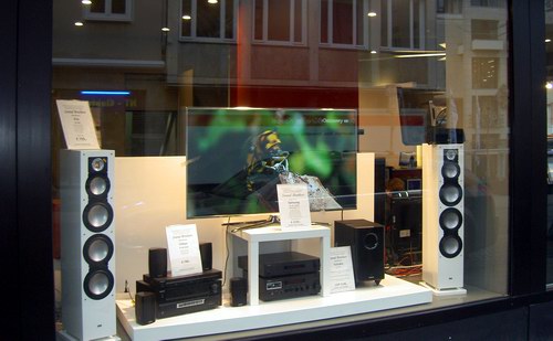 Schon von außen begrüßt den Besucher die große Schaufensterfront des Geschäftes, in der bereits die ersten kompletten Heimkinolösungen zu bewundern sind.