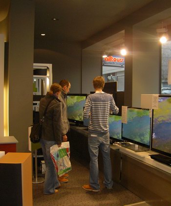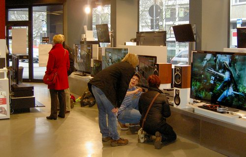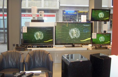 Und kaum ist man durch die Eingangstür, wird man von der schieren Auswahl in Sachen Flat-TVs überrascht. Man sieht direkt: Hier ist für jeden Geschmack und Geldbeutel etwas dabei.