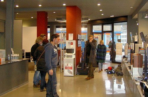 Fernseher im Eingangsbereich, hier wird bereits fleißig beraten…