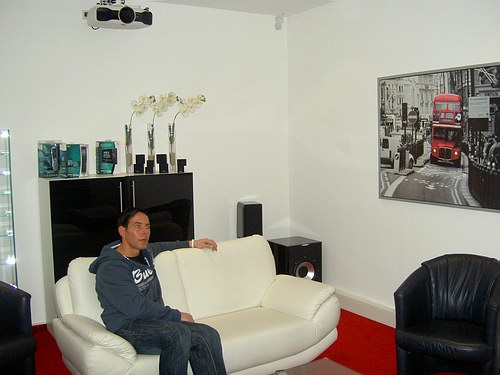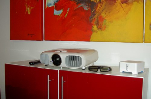 Ähnlich gut sieht es im zweiten Kinoraum aus, diesmal in den Farben Rot, Schwarz und Weiß. Ein günstiger TW6000 leistet hier die Großbilddienste und zeigt, dass man im Wohnzimmer auch auf eine Deckenmontage verzichten kann und der Beamer so den Raum optisch in keiner Weise stört.