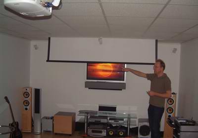 Im Alltagsbetrieb kommt dann der Großbildschirm zum Einsatz, der sich Platz-sparend hinter der Leinwand versteckt und bei Bedarf zum Vorschein kommt:
