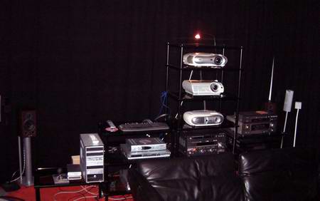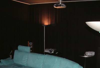 Der Cinema4 Raum ist klar der Technik-Kino-Raum. Im absolut optimierten Kinoambiente mit schwarzen Wänden und sogar schwarzen Sitzmöbeln kann hier jede Art der Zuspielung ausgetestet werden, von DVDs über Satellitenempfang bis hin zu HDTV vom Heimkino-PC (HTPC).