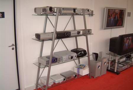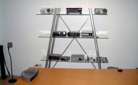 Gerade im Cinema5 Raumes zeigt sich der Ehrgeiz der Inhaber, wirklich jeden Bereich der Großbildprojektion abzudecken. Und auch hier ist die Auswahl beeindruckend: Ein ganzes Regal voll mit speziellen Präsentationsbeamern ist vorführbereit vorhanden:
