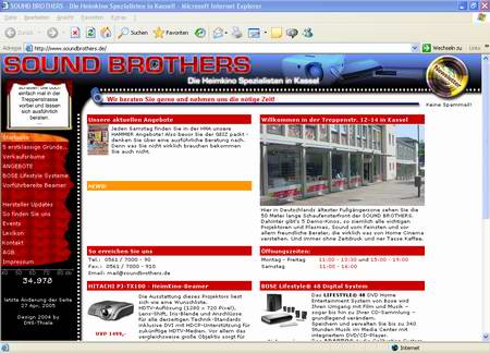 Wie jeder unserer Shopping-Mall-Partner sind auch die Sound Brothers im Internet mit einer vielseitigen Webseite vertreten. Ein regelmäßiger Besuch lohnt sich auf jeden Fall, da hier jede Woche spezielle Sonderangebote veröffentlicht werden. Gerade für Schnäppchenjäger sorgt dies für besonderen Spaß. Auch kann man sich über die Webseite kostenlos für den regelmäßigen Newsletter registrieren, der Sie automatisch über alle Neuheiten auf dem Laufenden hält!