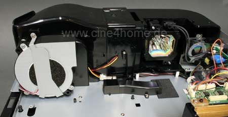 Die restlichen Komponenten des Projektors werden im Hufeisenprinzip mit Kühlluft versorgt. Die Kühlluft wird rechts von der Optik angesaugt, die schrägen Lamellen sorgen hier für einen Sichtschutz. Die frische Luft kühlt zunächst die Signalelektronik sowie das Netzteil, das sich darunter befindet. An der Rückseite wird die Luft U-förmig weiter auf die Lampe gelenkt, die hinten links positioniert ist, bevor die erhitzte Luft den Projektor wieder verlässt. Zur weiteren Veranschaulichung haben wir den schwarzen Lüftungskanal (Bild oben) geöffnet: