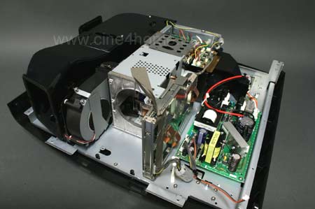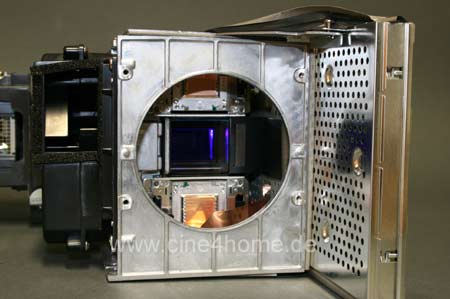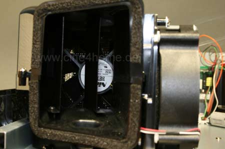Links im Bild ist der Lichteinlass zu erkennen, in den die Projektionslampe hinein scheint. An dieser Stelle befinden sich die ersten Integrator-Linsen, die das Licht homogenisieren. Über Spiegel geht es weiter ins D-ILA- Herz, das wir aus Staubschutzgründen nicht geöffnet haben. Man erkennt aber im Bild den verzweigten kleinen Lufteinlass mit Schaumstoffdichtung. Der Projektor verfügt über ein duales Kühlsystem, bei dem die optische Einheit einen eigenen Luftkanal besitzt. Die für die "Optical Engine" benötigte Kühlluft wird durch einen eigenen Lüfter von der Projektorenunterseite her angesaugt. Der Lüfter ist dabei senkrecht neben der Optik platziert: