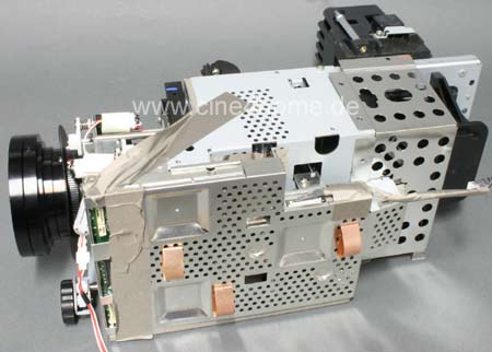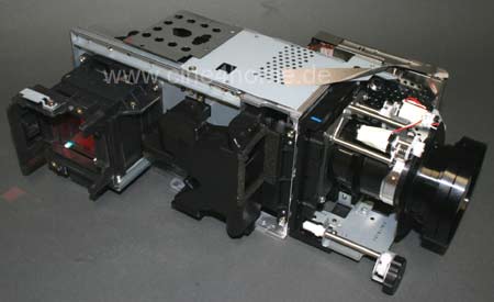 Im Bild oben sind bereits die Signalelektronik und die Projektionsoptik von uns entfernt worden. Letztere bietet nun gegenüber dem HD1 mehr Luxus durch einen motorischen Zoom & Fokus. Die Optik selbst blieb hingegen unverändert. Unmittelbar vor der Optik befindet sich eine Kammer mit Ausblick auf das Glasprisma, das die drei Bilder der individuellen D-ILA Panels vereint.