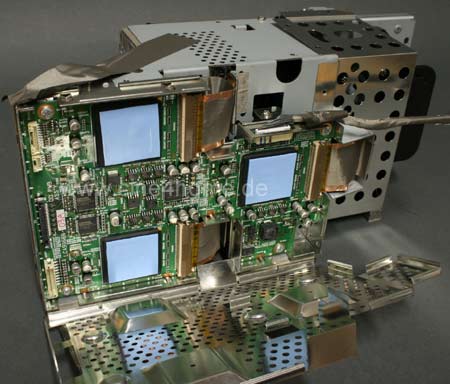 Entfernt man einen Teil der Schutzbleche, sieht man, wie komplex die D-ILA Engine in ihrer Ansteuerung ist. Allein für diese Aufgabe hat der der HD100 mehr Elektronik, als so manch anderer Beamer insgesamt.