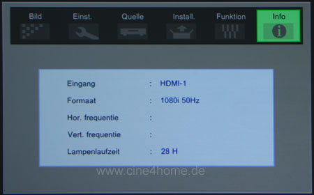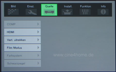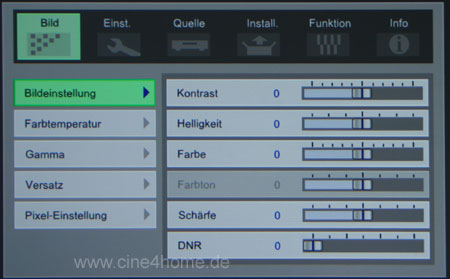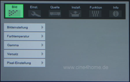 2.2 Menüs Die Menüstruktur ist nach wie vor übersichtlich in sechs Hauptkategorien, "Bild", "Einstellung", "Quelle", "Install", "Funktionen" und "Info", unterteilt. Dies erleichtert die Navigation ungemein. Hier die Rubriken im Detail: