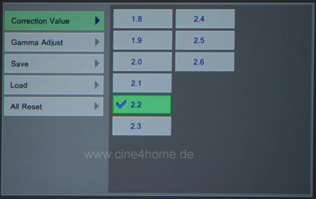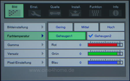 Wer selbst Hand anlegen möchte, der kann mittels RGB-Regler die Farbtemperatur in zwei Speicherbänken selbst beeinflussen. Wieso diese Bänke mit "Geheugen" ins Deutsche übersetzt wurden, wird wohl ein Geheimnis des Herstellers bleiben. Derartige Übersetzungsfehler sind in der Preisklasse eines HD100 schlicht und ergreifend peinlich. Als Ausgangspunkt für eigene Farbkalibrierungen ist aber stets "High", sprich alle Grundfarben maximiert (knapp unter der Clipping Grenze), weshalb sich die RGB-Regler auch nur ins Negative stellen lassen. Eine Nachjustage des "Mittel" Modus ist somit nicht möglich, was unter Umständen für Laien ohne Messinstrumente wesentlich einfacher gewesen wäre. Auffällig ist auch, dass der Projektor keine separaten Gain- (für helle Bereiche) und Bias- (für dunkle Bereiche) Regler aufweist. Stattdessen beeinflussen die Regler alle Helligkeiten. Gleiches gilt für die "RGB-Offset" Regler, auch hier beeinflusst man alle Helligkeitsstufen, allerdings in gröberen Schritten. . Doch weiterführende Farbtemperatur-Einstellungen kann man im Gamma-Menü vornehmen, das gegenüber zum Vorgänger wesentlich erweitert wurde. Dies war auch dringend notwendig, denn die Gammaoptionen des HD1 sind nach heutigen Standards alles andere als vorbildlich. Als Presets werden zunächst verschiedene Gamma-Einstellungen angeboten, die einsatzbezogen umschrieben sind. Welche Gammawerte welchem Preset entsprechen, werden wir im Laufe des Bildtests darlegen. Technisch interessant wird es, wenn man das "Anwender-" Gamma aktiviert: Es öffnet sich ein weiteres Untermenü, in dem man den Gammaanstieg direkt nach Zahlenwert aussuchen kann, so mag es der Kalibrierexperte.
