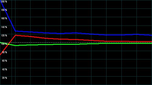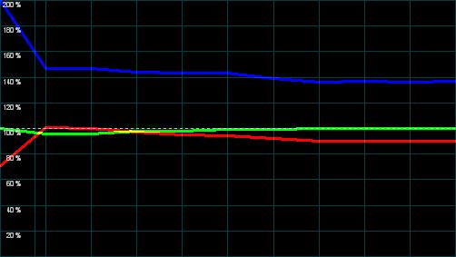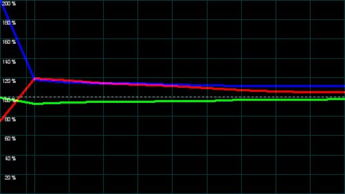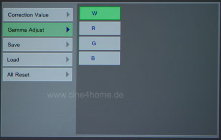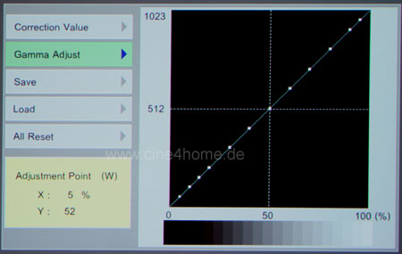 Ob die im Menü angegebenen Werte auch tatsächlich dem ausgegebenen Gammaanstieg entsprechen, werden wir im Bildtest ebenfalls überprüfen. Doch mit der numerischen Auswahl des Gammaanstiegs sind die Möglichkeiten noch nicht erschöpft. Der Menüpunkt "Gamma Adjust" ermöglicht darüber hinaus eine nachträgliche Justage der Gammakurve und zwar für jede Grundfarbe einzeln!