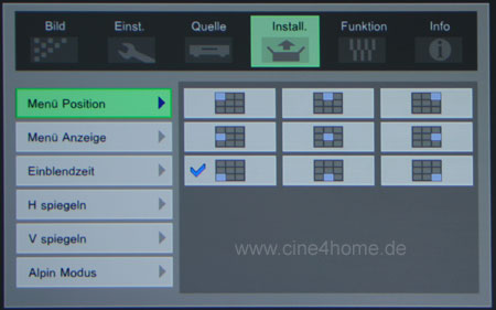 2.2.4 "Install"-Rubrik Neben Front- & Rückprojektion können hier die OSD-Menüs auf den eigenen Geschmack getrimmt und positioniert werden (vgl. Screenshot).