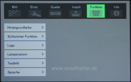2.2.5 "Funktions"-Rubrik Besonders erwähnenswert sind hier drei Funktionen: Mit "Schlummer-Funktion" können Anwender den Projektor davor schützen, dass er im Falle eines plötzlichen Schlafanfalls stundenlang weiterläuft und so wertvolle Lampenzeit verschwendet. Mit "Lampenstrom" kann die Lampenhelligkeit zwischen "Normal" und "Hoch" umgeschaltet und so die Bildhelligkeit beeinflusst werden. Die dritte praktische Funktion ist "Testbild", mit der zahlreiche Testbilder, von Farben bis Bildschärfe, abgerufen werden können.