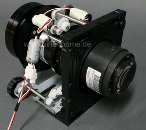 Der gesamte Lichtweg lässt sich als ein Modul aus dem Projektor nehmen und beeindruckt durch seine kompakte und zugleich solide Bauweise. Zur Veranschaulichung haben wir den Lichtweg mitsamt der Optik fotografiert.