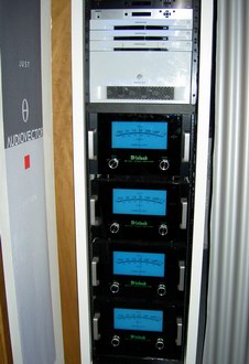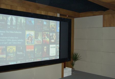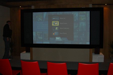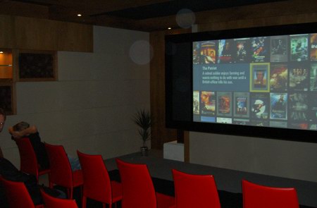 Im Bild oben ist das Kaleidescape-Server-System zu bestaunen. Hierbei handelt es sich um eine geniale Lösung, hunderte oder gar tausende von Spielfilmen zentral zu speichern, und für jeden Raum des Hauses als Bibliothek zur Verfügung zu stellen. Vorbei sind die Zeiten von mit Filmen überfüllter Regale. In jedem Raum ist jeder Film abrufbar, ein mechanischer Verschleiß der Filmscheiben entsteht ebenfalls nicht mehr. Auch über das Kaleidescape System werden wir in naher Zukunft genauer berichten. Die vier optisch eleganten McIntosh Endstufen runden den High-End Eindruck angemessen ab. Im Raum schließlich war neben der noblen Ausstattung vor allem eins dann zu sehen: Das Kinobild. Und wie, sage und schreibe 3,5m betrug die Breite der Full-Cinemascope Breitleinwand aus dem Hause Screen Research. Damit holt man sich das wahre Kinogefühl nach Hause.