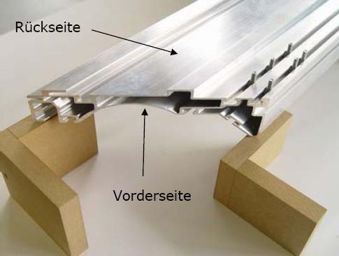 Das Bild oben zeigt das Grundprofil, in der halbrunden Form hat später die Welle für das Maskierungstuch Platz. Über die abgerundete Kante rechts wird das Leinwandtuch gespannt. Die Breite des Profils beträgt ca. 15cm, eine stabile Sache, auch bei großen Leinwänden.
