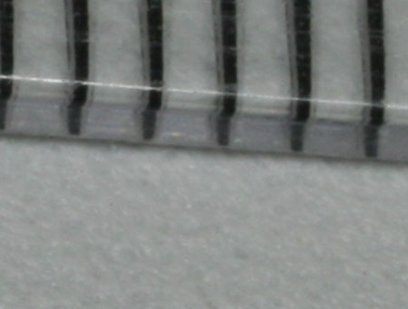 Dieses Bild zeigt die Oberfläche des iMasque Tuches, die schwarzen Striche sind die Millimetereinheiten eines Lineals. Wie man erkennt, ist die rauhe Oberflächenstruktur, die für die mattweiße Eigenschaft sorgt, derart fein, dass sie: