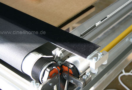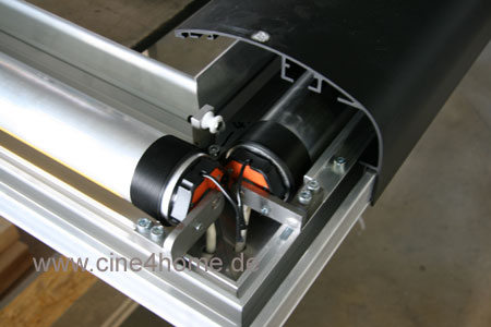 Das dunkle abgerundete Profil ist der Rahmen, wie man ihn von vorne sieht. Die Oberfläche wird nach Kundenwunsch ausgeführt, hier ist nahezu alles möglich, unsere Demoleinwand wird schwarz beflockt. Die Abdeckung steckt auf dem silbernen Grundprofil, das die Leinwand trägt. Auf den Wellen wird später das Maskierungstuch aufgewickelt, die orangefarbenen Elemete sind die Enden der Antriebsmotoren, die in den Wellen stecken, hier sieht man auch die Anschlußkabel dieser Motoren.