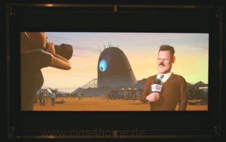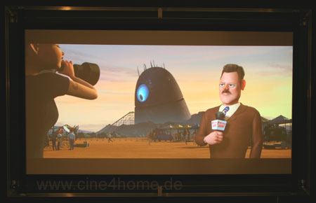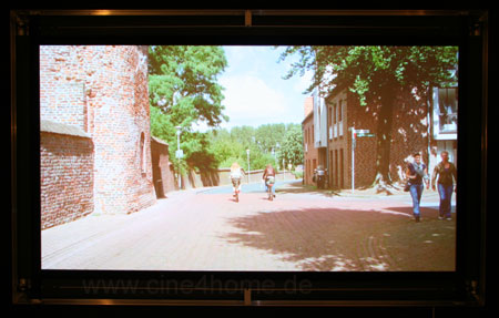 Wieder genügt ein Knopfdruck und wenige Sekunden später ist die Leinwand auf das Bildformat angepasst und sieht wesentlich kontrastreicher und harmonischer aus.