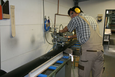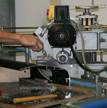 Die Abdeckprofile werden zugeschnitten, Winkel und Länge müssen genau stimmen. Es ist keine einfache Sache, das 3 Meter lange, abgerundete Profil sicher auf der Maschine aufzuspannen. Wird das Teil zu lang, lässt es sich nicht aufsetzen, zu kurz bedeutet unerwünschte Fugen in den Ecken. Präzision gehört für den Tischlermeister Günther Geiermann zum Handwerk, für ihn also kein echtes Problem