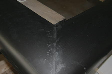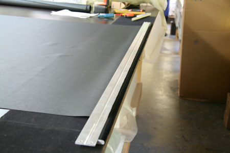 Eine fertig montierte Seitenmaskierung, gut erkennt man die schwarze, samtartige Beflockung der Schiene. Für die gesamte Leinwand müssen alle diese Arbeitsschritte noch dreimal wiederholt werden.