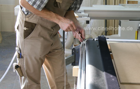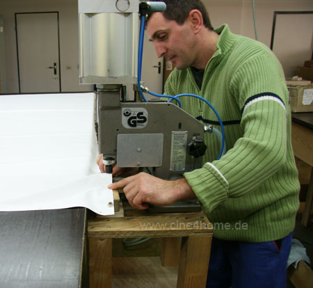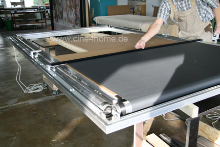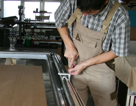 Man sieht leicht, wieviel Dutzend Arbeitsstunden in der iMasque-Leinwand stecken. Vom Zurechtschneiden der Profile und des Tuches, über die Montage bis hin zur finalen Programmierung wird ausnahmslos alles per Hand in der Fabrik Braunshorn durchgeführt. Das ist noch wirklich "made in Germany" in seiner Reinstform.