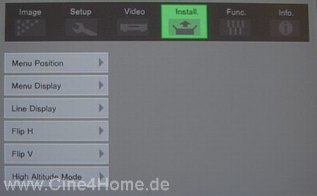 Das Install Menü bietet selbsterklärend alle relevanten Optionen zur Aufstellung des Projektors.
