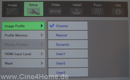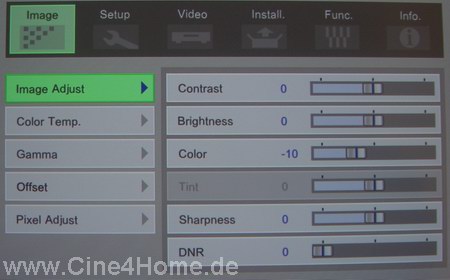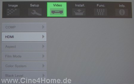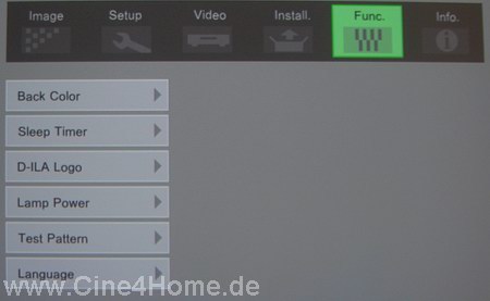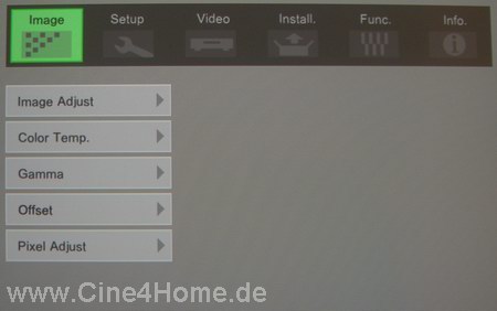 Die Menüstruktur des DLA-HD1 ist in sechs Hauptkategorien, "Image", "Setup", "Video", "Install", "Func." und "Info" unterteilt. Hier die Rubriken im Detail: