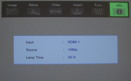 Wie man oben erkennt, ist das Pre-Production Gerät 50 Stunden alt und wurde bei unserem Preview nativ mit 1080p Material gefüttert, was der Projektor in 50Hz, 60Hz und auch 24Hz verarbeiten kann.