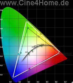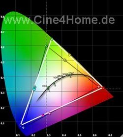 2.2 Farbtemperatur (Know How Link hier) Interessant ist stets die werksseitige Einmessung der Farbtemperatur: Hier zeigen viele Projektoren deutliche Schwächen, die aber zum Glück mit Hilfe des Bildmenüs meist korrigiert werden können. In der Preisklasse eines DLA-HD1 setzen wir aber höhere Maßstäbe, hier erwarten wir eine gewissenafte Einmessung der Farbtemperatur bereits ab Werk. Unsere Erwartungen wurden dabei erfüllt, der Messsensor bescheinigte dem Projektor einen hervorragenden Abgleich auf die D65-Videonorm, ohne dass von uns nachgeregelt werden musste.