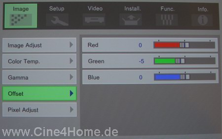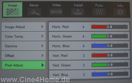 Alle drei(!) Grundfarben können sowohl horizontal als auch vertikal verschoben werden, und das gleich um mehrere Pixel. Mit Hilfe dieses Menüs ist es daher möglich, im besonders wichtigen Teil des Bildes, Bildmitte, eine Konvergenzverschiebung von nicht mehr als einem halben Pixel zu realisieren. Viele Heimkinofans werden sich über die Option besonders freuen, ließ sie doch ein Sony Ruby oder Pearl so schmerzlich vermissen.
