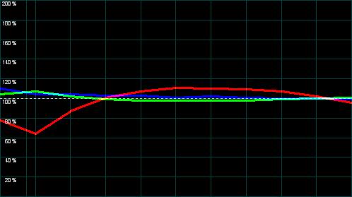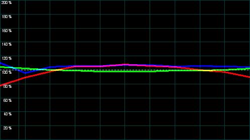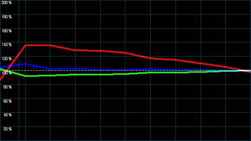 Der Weißpegel stimmt also, doch was ist mit den anderen Graustufen passiert? Hier entwickelt sich die Werkskalibrierung zu einem störenden Bumerang: Das Rotgefälle bleibt nämlich erhalten, hat sich durch die Farbkorrektur aber nach oben verschoben. Mit adaptiver Blende ist der Effekt sogar noch stärker ausgeprägt: