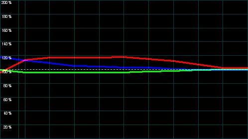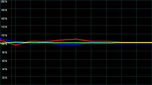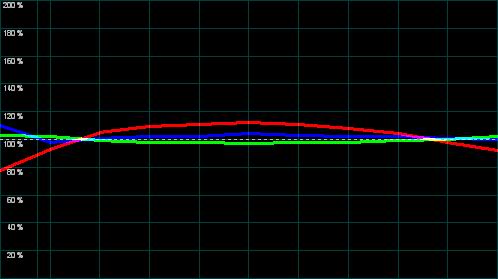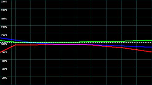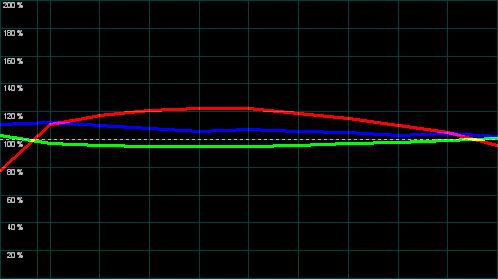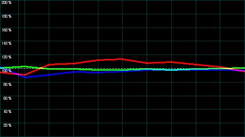 Leider gar nicht so gut sieht es in der Farbtemperatur aus. Um in niedrigen und mittleren Helligkeiten eine halbwegs akzeptable Farbreproduktion zu gewährleisten, hat man die RGB-Verteilung "so lange es geht" an der D65 / 6500K Farbnorm orientiert, wie die Messung zeigt.