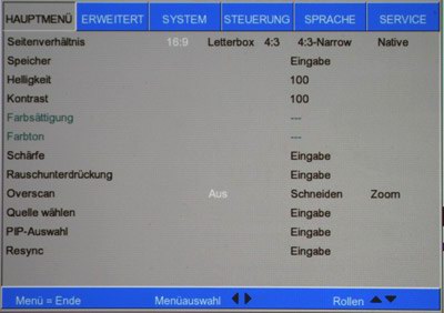 Die Bildränder können im Hauptmenü in drei Stufen beeinflusst werden. Mit Overscan "Aus" wird der gesamte Bildinhalt ohne abgeschnittene Bildränder dargestellt. Dies ist der Modus, den man für DVDs oder die HD-Wiedergabe von Blu-ray & Co. wählt, um beste Ergebnisse zu erhalten.
