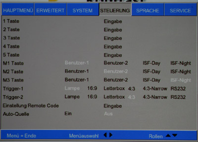 Lobenswert und bislang bei Heimkino-Beamern immernoch eine Seltenheit ist ein eigenes Steuermenü (oben), mit dem man diverse Tasten der Fernbedienung aber auch Triggersignale programmieren kann. An dieser Stelle zeigt sich erneut, dass Planar mit dem PD8150/30 auf möglichst perfekte und komfortable Integrationsmöglichkeiten in gehobenen Heimkinos setzt.