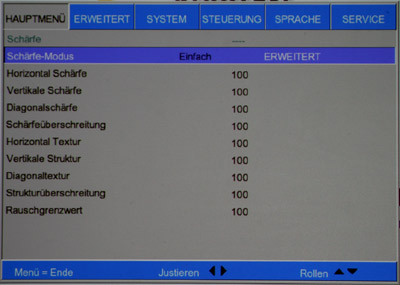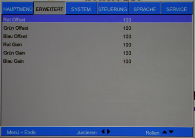Wirklich vorbildlich ist auch die Service-Rubrik, in der man detaillierte Informationen über die eingestellten Projektoren-Parameter ablesen kann. Hervorheben wollen wir den "Nur Blau" Modus, der die Kalibrierung der Farbsättigung ohne den Einsatz oft ungenauer Blau-Filter ermöglicht.