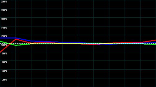Von Dunkelgrau bis Weiß hält der Projektor die D65-Farbtemperatur in allen Graustufen gut ein. Besonders in den dunklen Bereichen ist dies eine Seltenheit, erstrecht ab Werk. Somit ist ohne große Nachkorrektur eine adäquate Farbmischung gewährleistet. Wer sich aber dennoch an den leichten Abweichungen von Rot oder Blau stört, der kann mit Hilfe des RGB-Menüs nach üblicher Vorgehensweise die Graustufen kalibrieren.