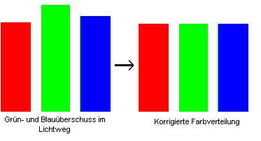 2.3.2 Helligkeitsangaben der Hersteller Betrachten wir ein Beispiel zur Veranschaulichung. Wie bereits erläutert, ist das Farbspektrum des Projektionslichtes nicht optimal: Eine oder zwei Farben sind dominant. Unser Beispielprojektor hat einen starken Rotmangel, d.h. es gibt wesentlich mehr Blau- und Grünanteile im Licht als Rotanteile.