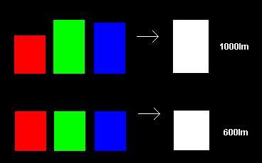 Produziert ein Projektor z.B. weniger Rot als Grün und Blau (dies ist bei UHP Lampen die Regel), so bestimmt Rot die maximal mögliche Helligkeit bei einem Weiß von 6500°K. Grün und Blau könnten zwar noch "höhergedreht" werden, würden aber die Farbtemperatur verändern. Ein Fehler der oft nicht bemerkt wird: Zu hoch eingestellter Kontrast zwingt den Projektor, die Grundfarben über die limitierende Farbe hinaus zu maximieren. Hier setzt die Problematik der Werks-Angaben ein: