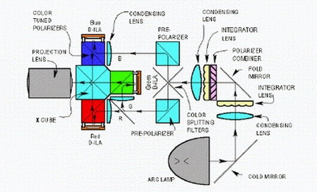Um aus dem Weißlicht der verwendeten Lampe die einzelnen Grundfarben zu erzeugen, sind teildurchlässige Spiegel und Prismen notwendig. Diese Spezialspiegel lassen grundsätzlich nur Licht eines bestimmten Wellenlängenbereichs (Farbe) hindurch und reflektieren das restliche Licht. Das folgende Diagramm zeigt den theoretischen Aufbau eines LCD-Projektors: